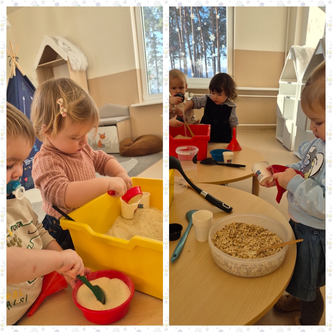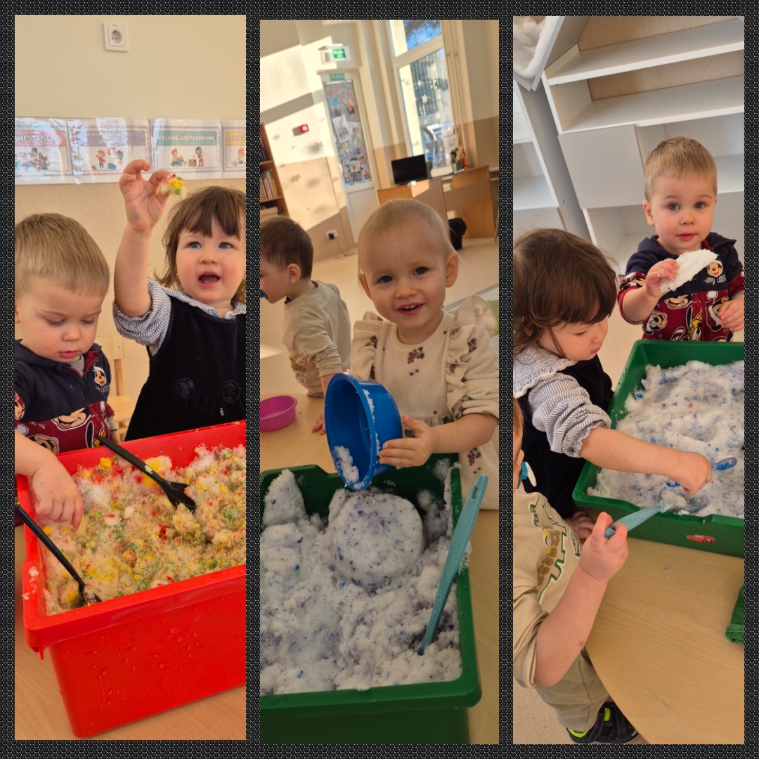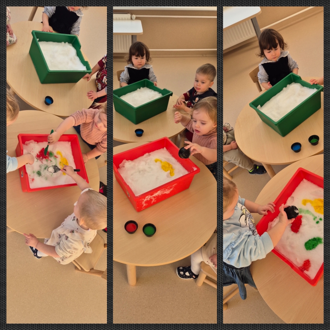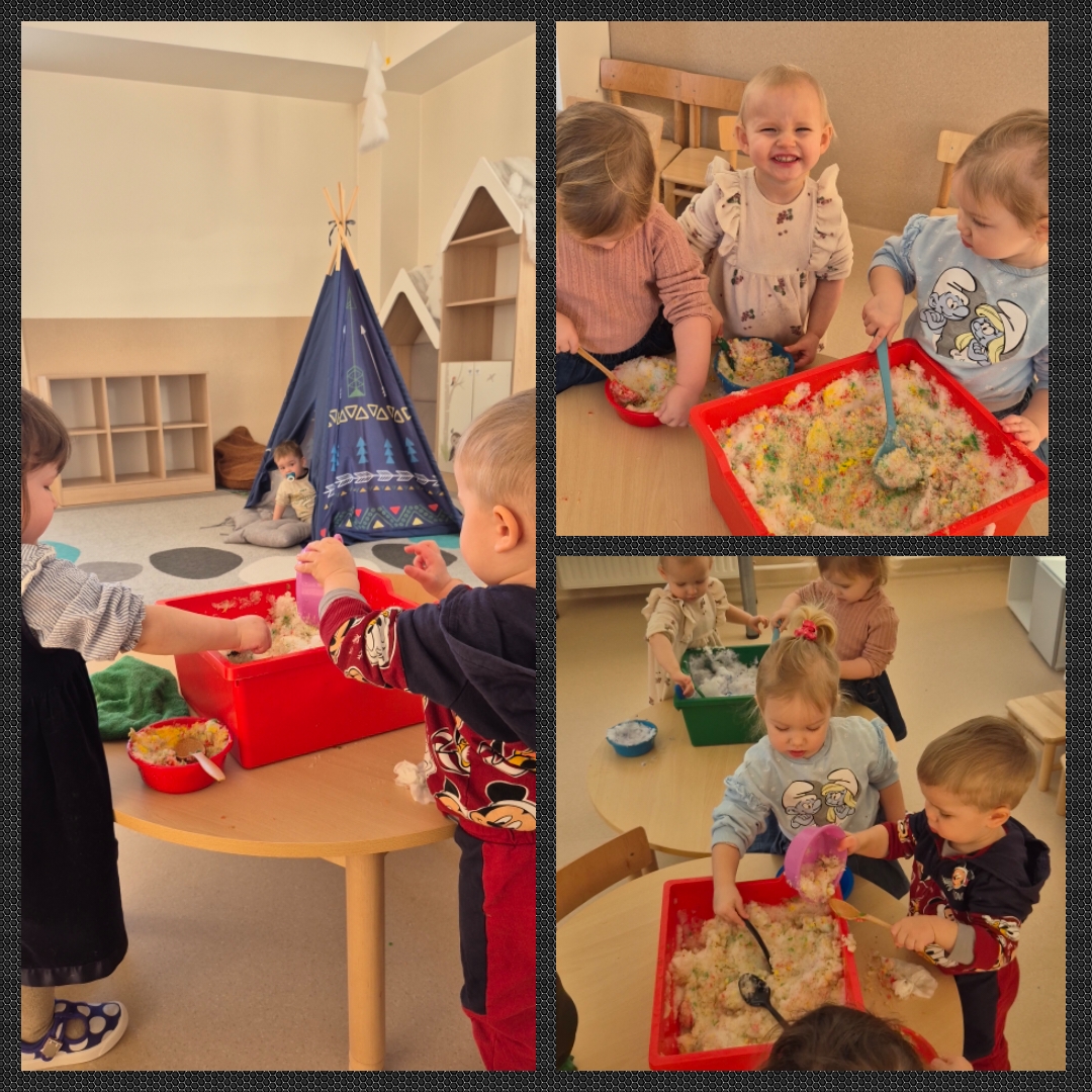 Visą dieną ugdytiniai eksperimentavo su sniegu ir guašu, dalyvavo sensorinėse veiklose su kruopomis, jas bėrė, pylė, matavo, slėpė daiktus jose ir jų ieškojo, piešė, klausėsi byrančių kruopų „lietaus“, naudojo įvairius plastikinius įrankius. Visiems kartu buvo smagu pabūti ,,Draugystės namelyje“ ir pasimokyti bendrystės bei dalijimosi įgūdžių.