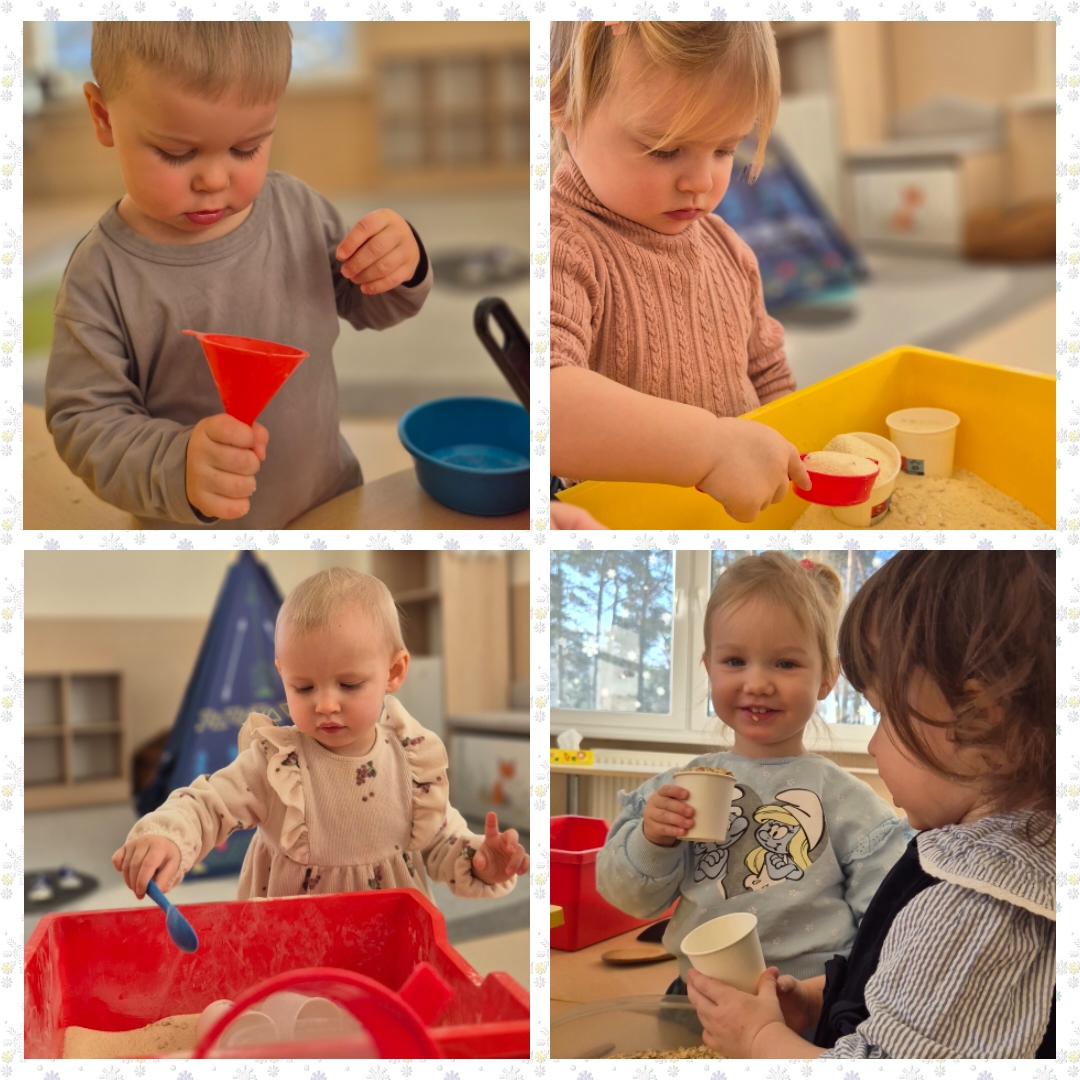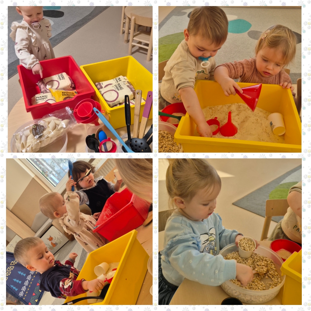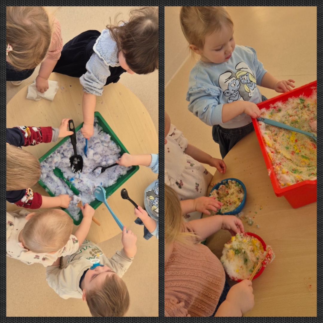 Visą dieną ugdytiniai eksperimentavo su sniegu ir guašu, dalyvavo sensorinėse veiklose su kruopomis, jas bėrė, pylė, matavo, slėpė daiktus jose ir jų ieškojo, piešė, klausėsi byrančių kruopų „lietaus“, naudojo įvairius plastikinius įrankius. Visiems kartu buvo smagu pabūti ,,Draugystės namelyje“ ir pasimokyti bendrystės bei dalijimosi įgūdžių.